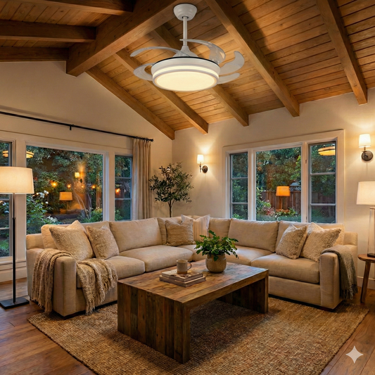 Ventilateur de Plafond CALYSA 106cm avec Pales Escamotables et LED 33W Grand Ventilateur Silencieux 34dB pour Salon et Chambre Moteur DC 30W Basse Consommation Réversible Été Hiver avec Télécommande Plafonnier 3500 Lumens Blanc et Bois