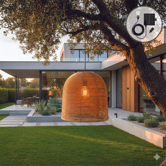 Suspension solaire HANG BOHEME SOLAR en poly rotin avec câble hybride secteur et solaire 5m de longueur