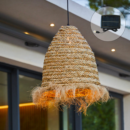 Suspension solaire bohème naturel style vannerie tressée LED blanc chaud MAYA H39cm